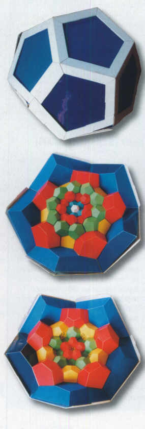 Die 120 Dodekaeder erscheinen in neun Schichten: zumindest das Baby (Mitte), klein, weiß und unverzerrt, darum der Reihe nach 12 blaue, 20 rote, 12 gelbe, 30 grüne, 12 gelbe, 20 rote und 12