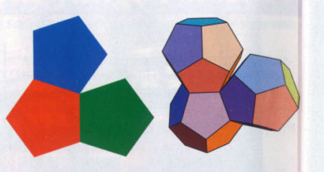Drei regelmäßige FünfeckeDrei regelmäßige Fünfecke in der Ebene lassen eine Lücke, die durch Falten entlang der gemeinsdamen Kanten geschlossen wird (links).