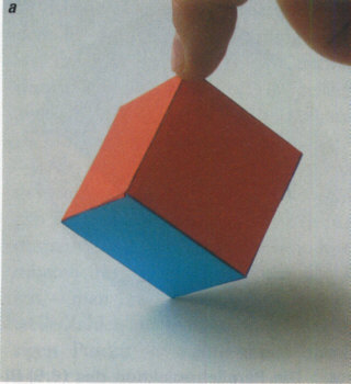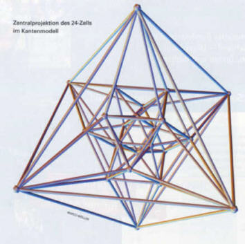 blaue Dodekaeder, die immer größer und verzerrter werden (alle Dodekaeder einer Schicht sind kongruent). Das alles umschließende weiße Dodekaeder, der Käfig (oben), ist wieder unverzerrt. Die Zentralprojektion eines 24-Zells im Kantenmodell Ein Würfel auf die Spitze gestellt (a) und von oben mit parallelem